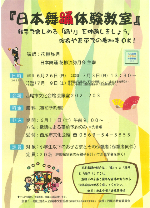 西尾市文化会館自主企画事業 「日本舞踊体験教室」 開催日時 1回目 2022年6月26日(日)2回目 7月3日(日)13:30~ (予備日3回目)7月9日(土) 講師 花柳弥月 氏 会場 会議室202・203 対象 小学生以下のお子さまとその保護者(保護者同伴) 定員 20名(体験希望者のみ親子合計/付添見学者を除く) 参加料 無料(事前予約制) 申込方法 6/11(土)9:00~電話による事前予約のみ(先着順) 問合せ先 西尾市文化会館 電話 0563-54-5855