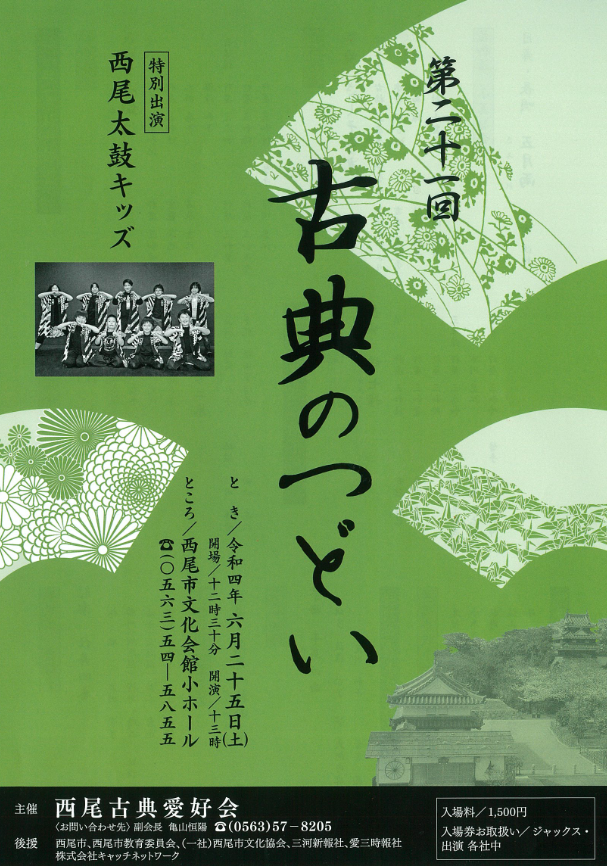 第二十一回 古典のつどい 開催日時 2022年6月25日(土) 開場12:30 開演13:00 会場 小ホール 入場料 1,500円 入場券取扱い ジャックス・出演各社中 問合せ先 西尾古典愛好会 副会長 亀山 0563-57-8205