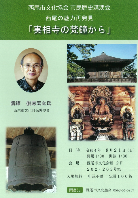 西尾市文化協会 市民歴史講演会 西尾の魅力再発見「実相寺の梵鐘から」 開催日時 2022年8月21日(日)開場 13:00 開演 13:30 講師 榊原宏之 氏 会場 会議室202・203 入場料 無料 申込不要 定員100名 問合せ先 西尾市文化協会 0563-56-5757