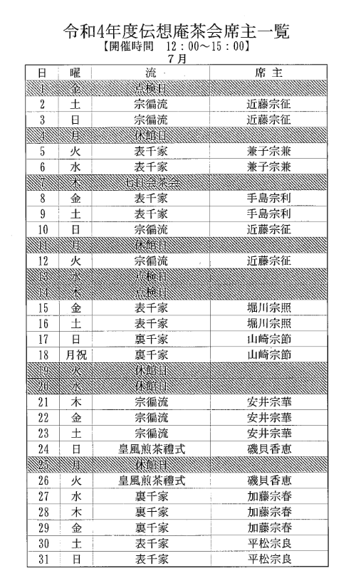 伝想庵茶会(7月席主一覧) 開催時間 12:00から15:00まで ※新型コロナウィルス感染拡大防止のため、お点前は中止し、点出しにて呈茶いたします。 料金 一服 300円 会場 茶室 伝想庵 問合せ先 一般社団法人西尾市文化協会 0563-54-5855