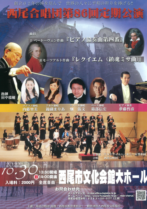 西尾合唱団第86回定期公演 開催日時 2022年10月30日(日) 開場13:00 開演14:00 会場 大ホール 指揮 田中瑞穂 チケット料金 全席自由 2,000円 問合せ先 西尾合唱団渉外 三浦 0563-56-5177