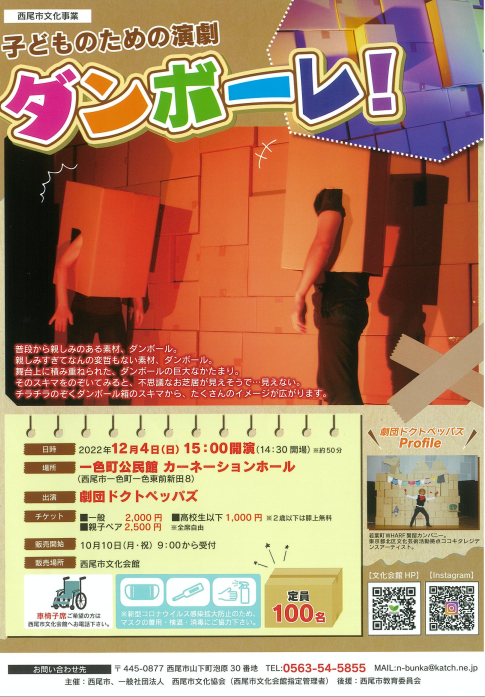 西尾市文化事業 子どものための演劇「ダンボーレ!」【会場】一色町公民館カーネーションホール 開催日時 2022年12月4日(日) 開場 14:30 開演 15:00(約50分) 会場 一色町公民館 カーネーションホール 入場料 一般 2,000円 高校生以下 1,000円 親子ペア 2,500円 ※全席自由 定員100名 ※2歳以下は膝上無料 ※車椅子席ご希望の方は西尾市文化会館へお電話下さい。 チケット販売 10月10日(月祝)9:00~ 西尾市文化会館にて 問合せ先 一般社団法人西尾市文化協会 0563-54-5855
