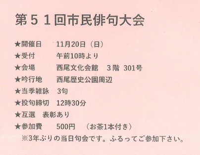 第51回市民俳句大会 開催日時 2022年11月20日(日) 10:00~ 会場 西尾市文化会館 3階会議室301号室 参加費 500円 (事前予約不要) 問合せ先 (一社)西尾市文化協会 0563-56-5757