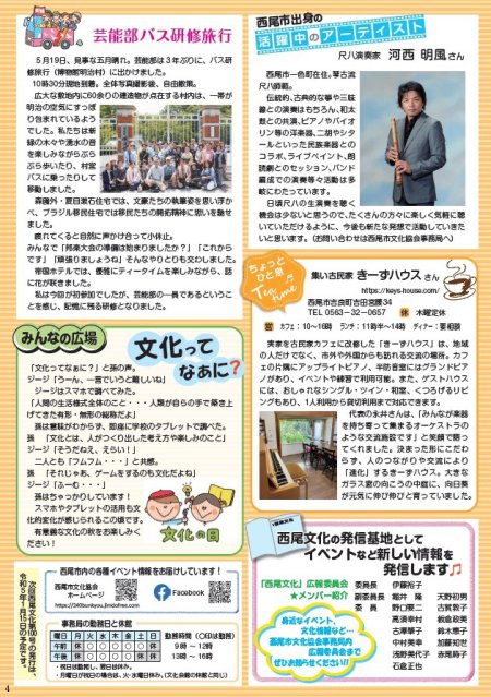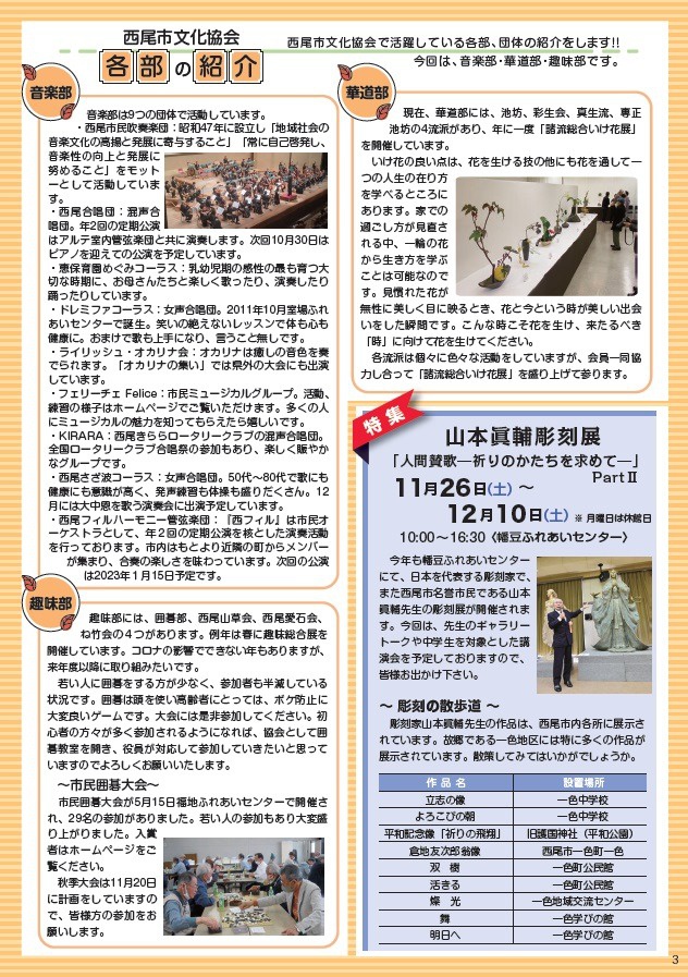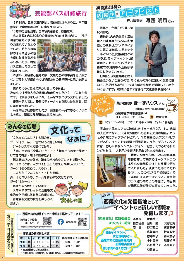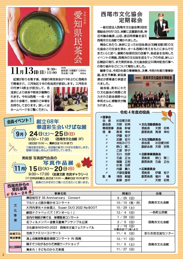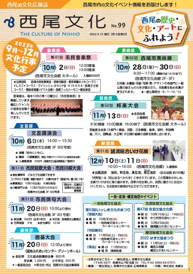 西尾の文化広報誌 「西尾文化」 №99 西尾の歴史・文化・アートにふれよう! 西尾の文化広報誌「西尾文化」№99 を9/15に発行しましたのでご覧ください!! 【訂正】2ページ目の会員イベント 創立68年華道彩生会いけばな展 の開催時間は、正しくは「24日は10~17時、25日は10~16時」です。
