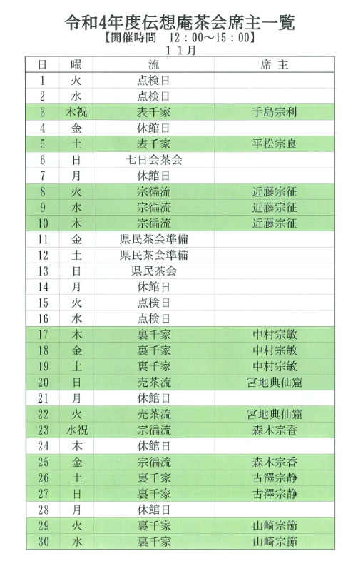 伝想庵茶会(11月席主一覧) 開催時間 12:00から15:00まで ※新型コロナウィルス感染拡大防止のため、お点前は中止し、点出しにて呈茶いたします。 料金 一服 300円 会場 茶室 伝想庵 問合せ先 一般社団法人西尾市文化協会 0563-54-5855