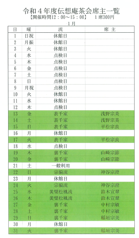 伝想庵茶会(1月席主一覧) 開催時間 12:00から15:00まで ※新型コロナウィルス感染拡大防止のため、お点前は中止し、点出しにて呈茶いたします。 料金 一服 300円 会場 茶室 伝想庵 問合せ先 一般社団法人西尾市文化協会 0563-54-5855