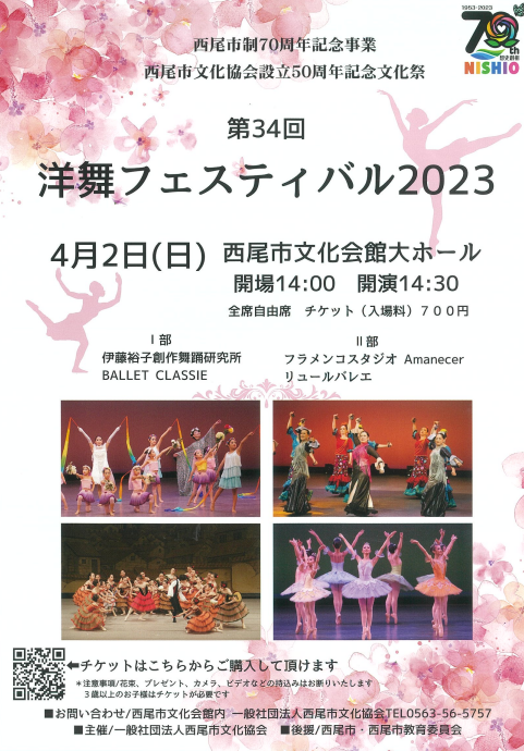 西尾市制70周年記念事業 西尾市文化協会設立50周年記念文化祭 第34回洋舞フェスティバル2023 開催日時 2023年4月2日(日) 開場 14:00 開演 14:30 会場 大ホール 入場料 700円(全席自由席) 3歳以上のお子様はチケットが必要です 問合せ先 一般社団法人西尾市文化協会 0563-56-5757